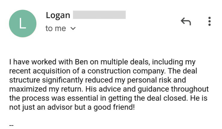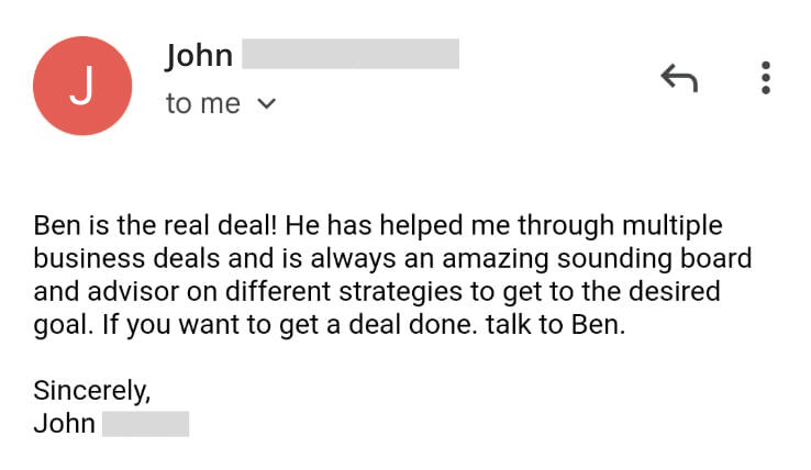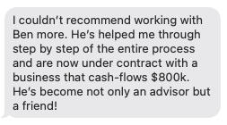 Within 12 weeks, you get a deal under contract, or I’ll work with you until you get it.And in the highly unlikely event that we both can't get a deal done, I'll refund you all your money.In the worst-case scenario:You’ll have all the knowledge to acquire profitable businesses.Zero risk on your part.Now, in the normal case scenario (what happens to all my mentees):
